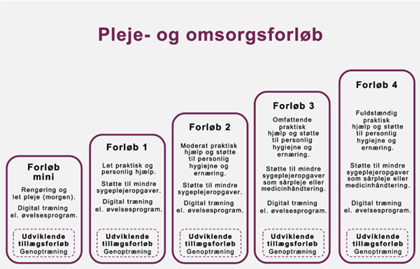 I Syddjurs Kommune tilbyder vi helhedspleje i fire sammenhængende- og rummelige forløb samt et mindre individuelt forløb til dig, der kun har et mindre behov for praktisk støtte og personlig pleje. Med et forløb er det muligt for din leverandør selv at administrere, tilrette og justere hjælpen sammen med dig i det daglige. Forløbene er sammensat, så du får en sammenhængende indsats, der kombinerer forskellige typer hjælp og pleje. Når du har fået bevilget et forløb, er det borgerteamet, der løbende tilrettelægger og justerer hjælpen sammen med dig. Se figur 1.