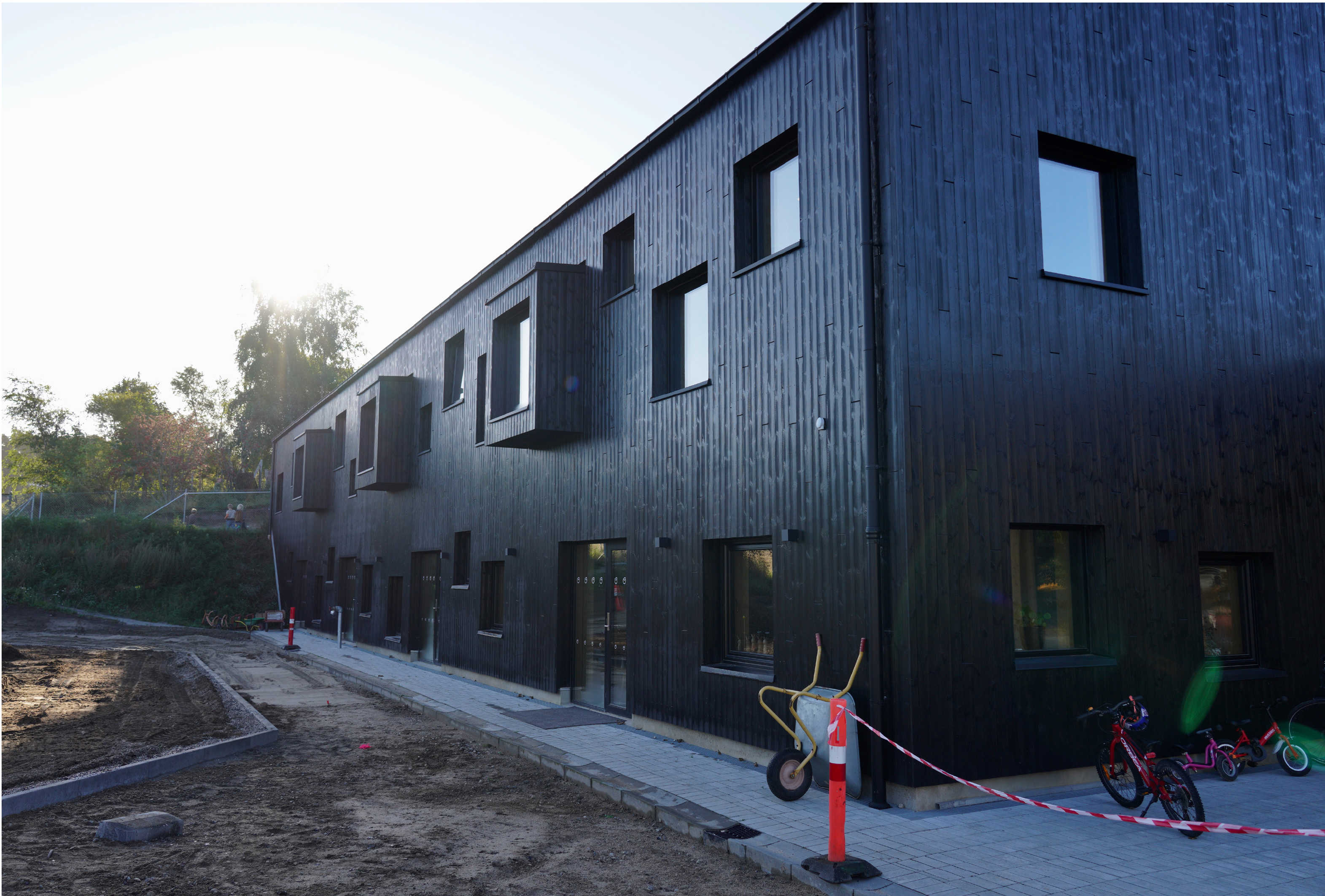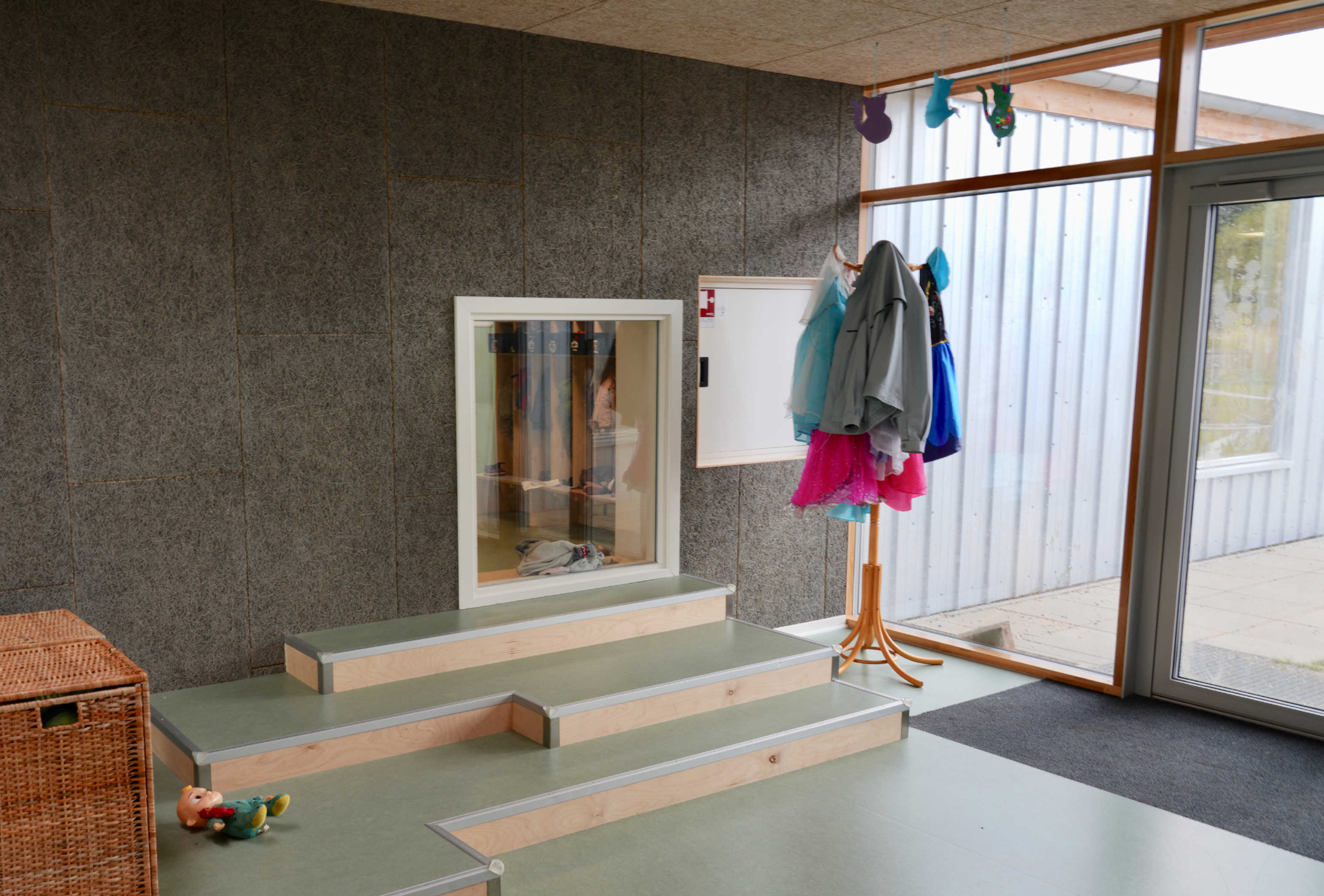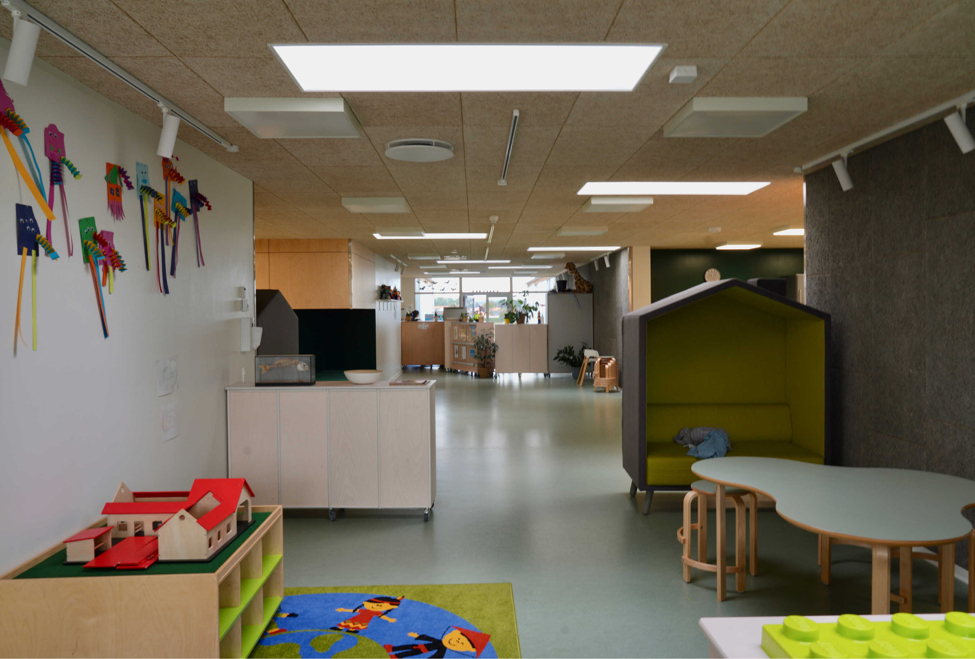 I det nye børnehus er der tænkt over målgruppen. I udformning og orientering mimer den træbeklædte sortmalede bygningskrop de eksisterende skolebygninger, mens en række vinduesvolumener ved ankomst giver en pudsig opdelt facaderytme, der ikke fremstår umiddelbar aflæselig, før man kommer indenfor og forstår, at placeringen er betinget af, at børnene skal kunne bruge de brede vindueshuller til leg, pauser og udkig, heraf opstår de forskellige højder og placeringer. På stuerne ses også specialdesignede møbler på hjul til opbevaring af legetøj, så stuerne kan holdes ryddelige og rummene således kan bruges til forskellige pladskrævende aktiviteter. Den direkte udgang til legepladsens terræn fra første etage viser, hvordan huset udnytter stedets iboende værdier og formår at forene eksisterende kvaliteter med nye funktioner.