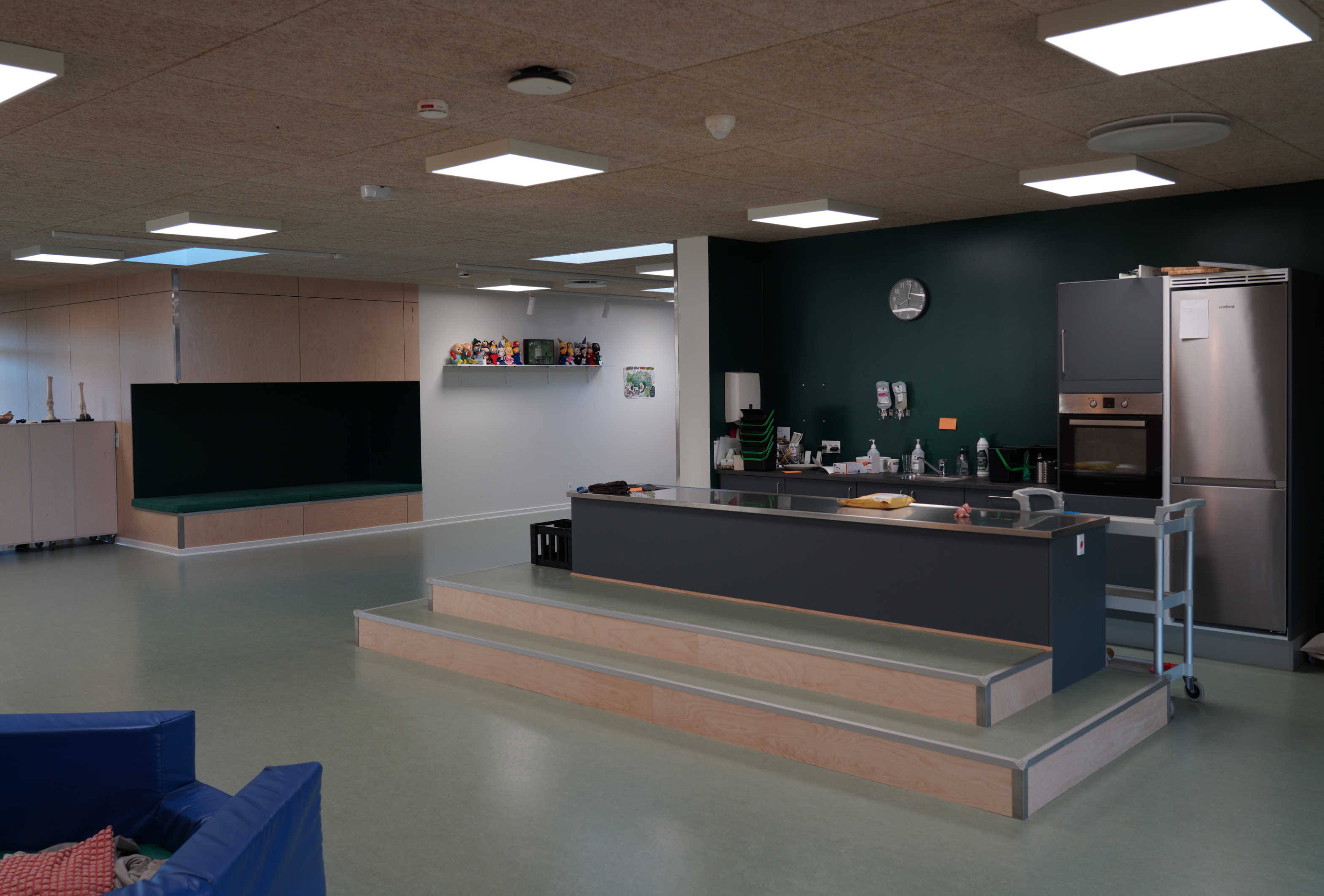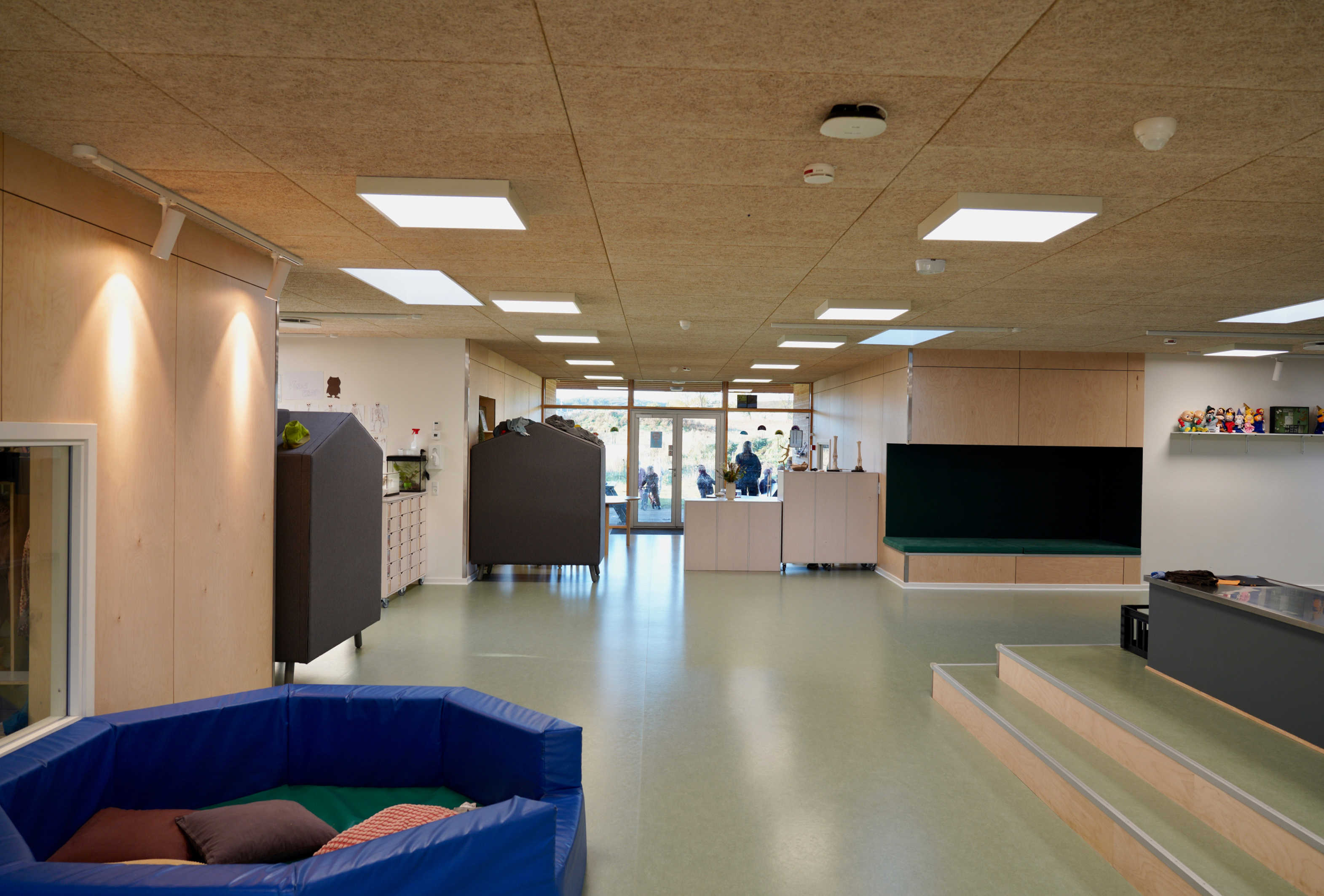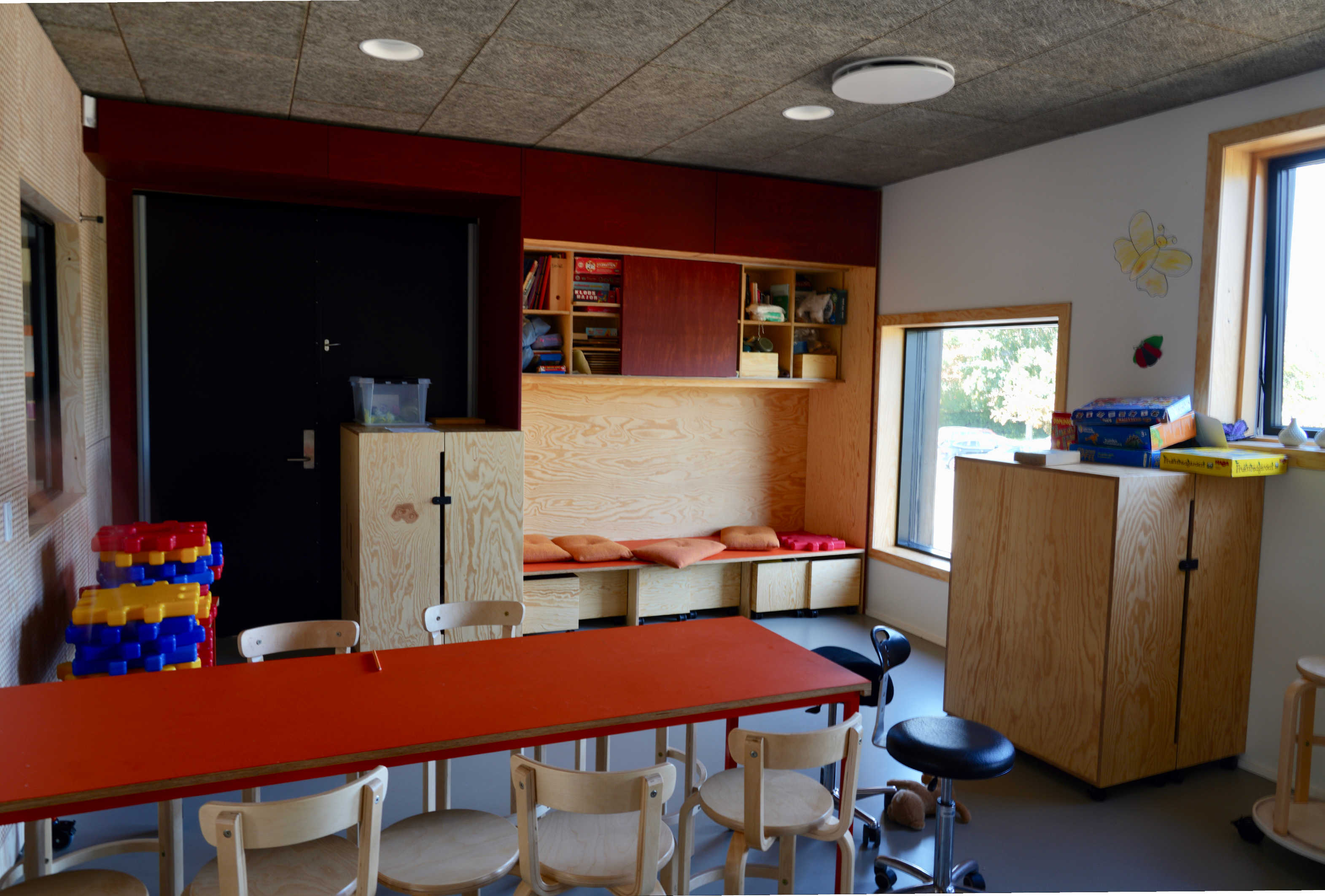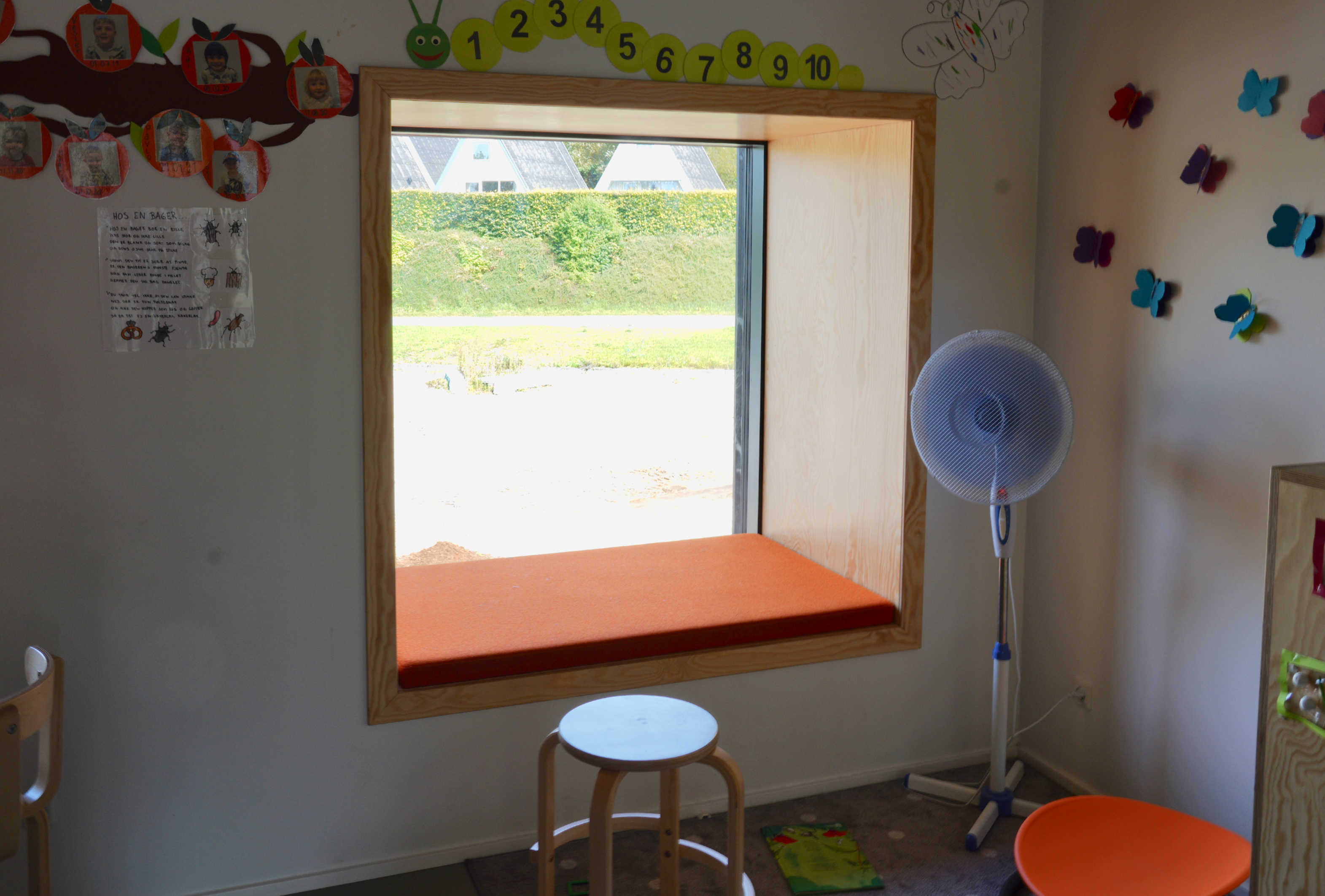 I det nye børnehus er der tænkt over målgruppen. I udformning og orientering mimer den træbeklædte sortmalede bygningskrop de eksisterende skolebygninger, mens en række vinduesvolumener ved ankomst giver en pudsig opdelt facaderytme, der ikke fremstår umiddelbar aflæselig, før man kommer indenfor og forstår, at placeringen er betinget af, at børnene skal kunne bruge de brede vindueshuller til leg, pauser og udkig, heraf opstår de forskellige højder og placeringer. På stuerne ses også specialdesignede møbler på hjul til opbevaring af legetøj, så stuerne kan holdes ryddelige og rummene således kan bruges til forskellige pladskrævende aktiviteter. Den direkte udgang til legepladsens terræn fra første etage viser, hvordan huset udnytter stedets iboende værdier og formår at forene eksisterende kvaliteter med nye funktioner.