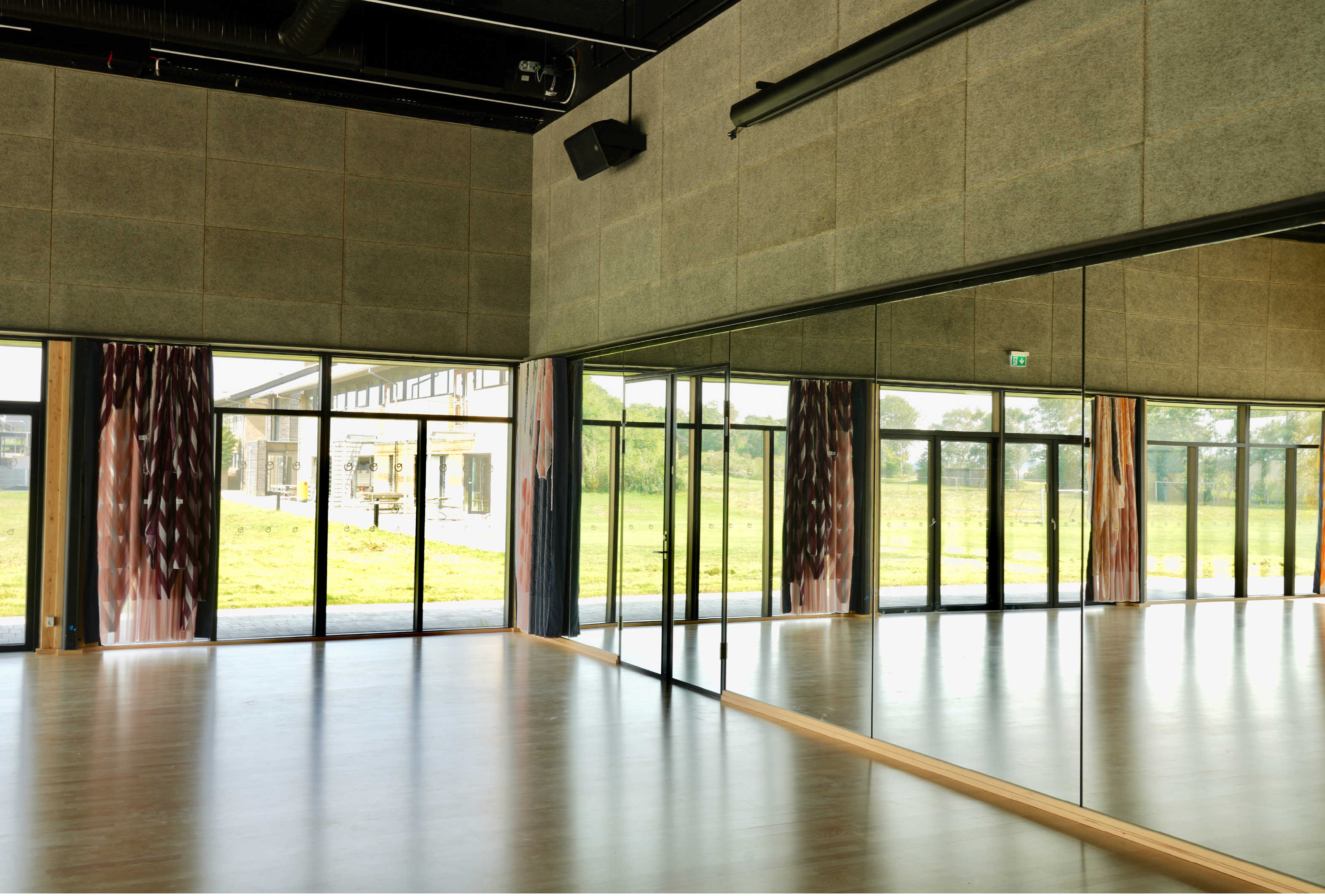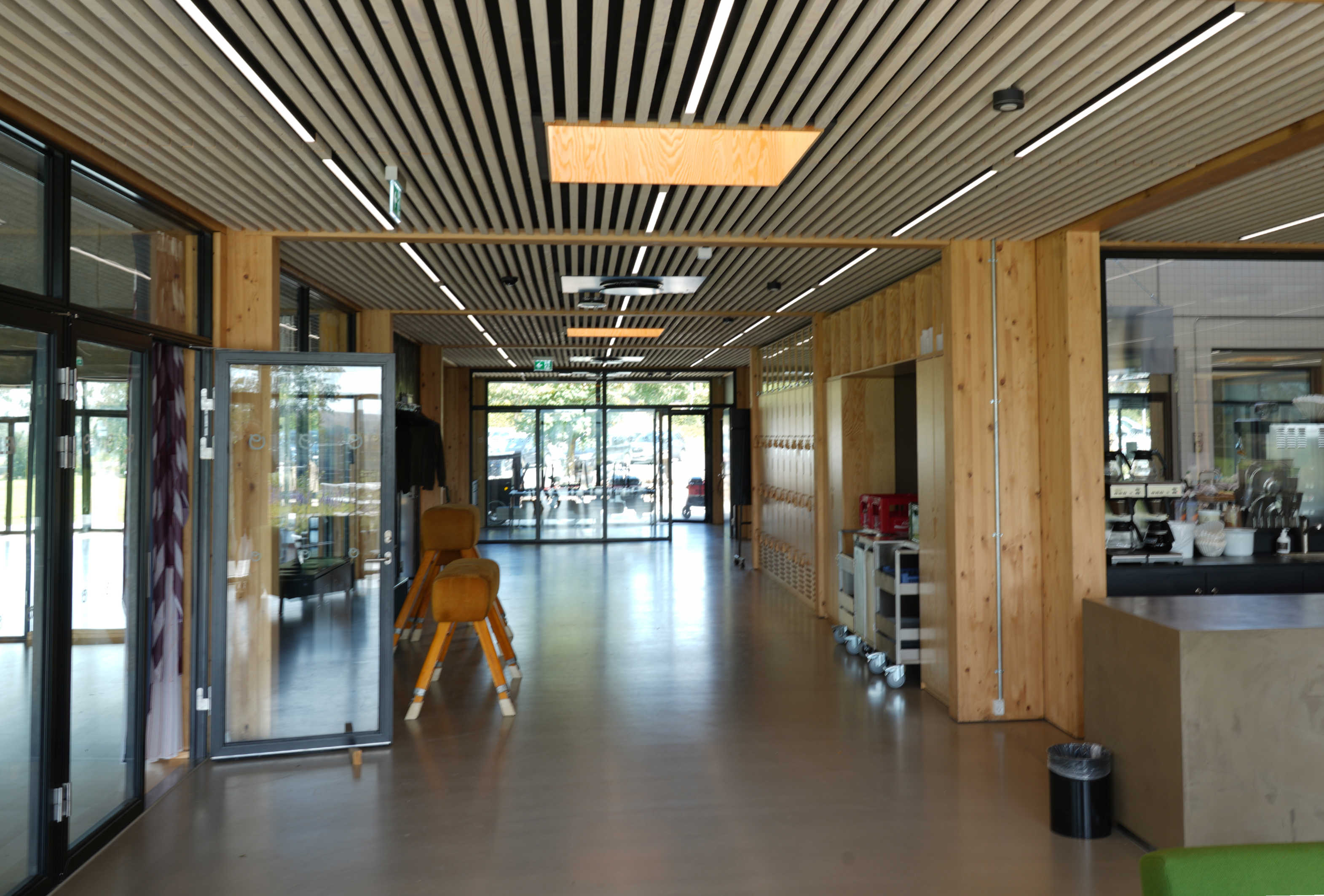 Den nye multisal og det nye madhus står som to sorte separate kuber mens en lavere bygning binder nyt og gammelt sammen og skaber et flow mellem de forskellige funktioner. I gangarealerne mellem funktionerne, er der indarbejdet opholdsarealer i form af sidde-nicher, reoler og opbevarings- og opholdsmøbler. Huset fremstår med betongulve og træoverflader samt store glaspartier ved ankomst og ud mod idrætsbanerne, hvilket skaber en lys og gennemsigtig bygning i et enkelt og aflæseligt udtryk. Huset fremstår gedigent og solidt både i materialevalg og farveholdning, samt i mødet mellem nye og gamle materialer som f. eks når en tidligere udendørs facade i blank gul mur nu danner bagvæg for et nyt tekøkken i et mødelokale.