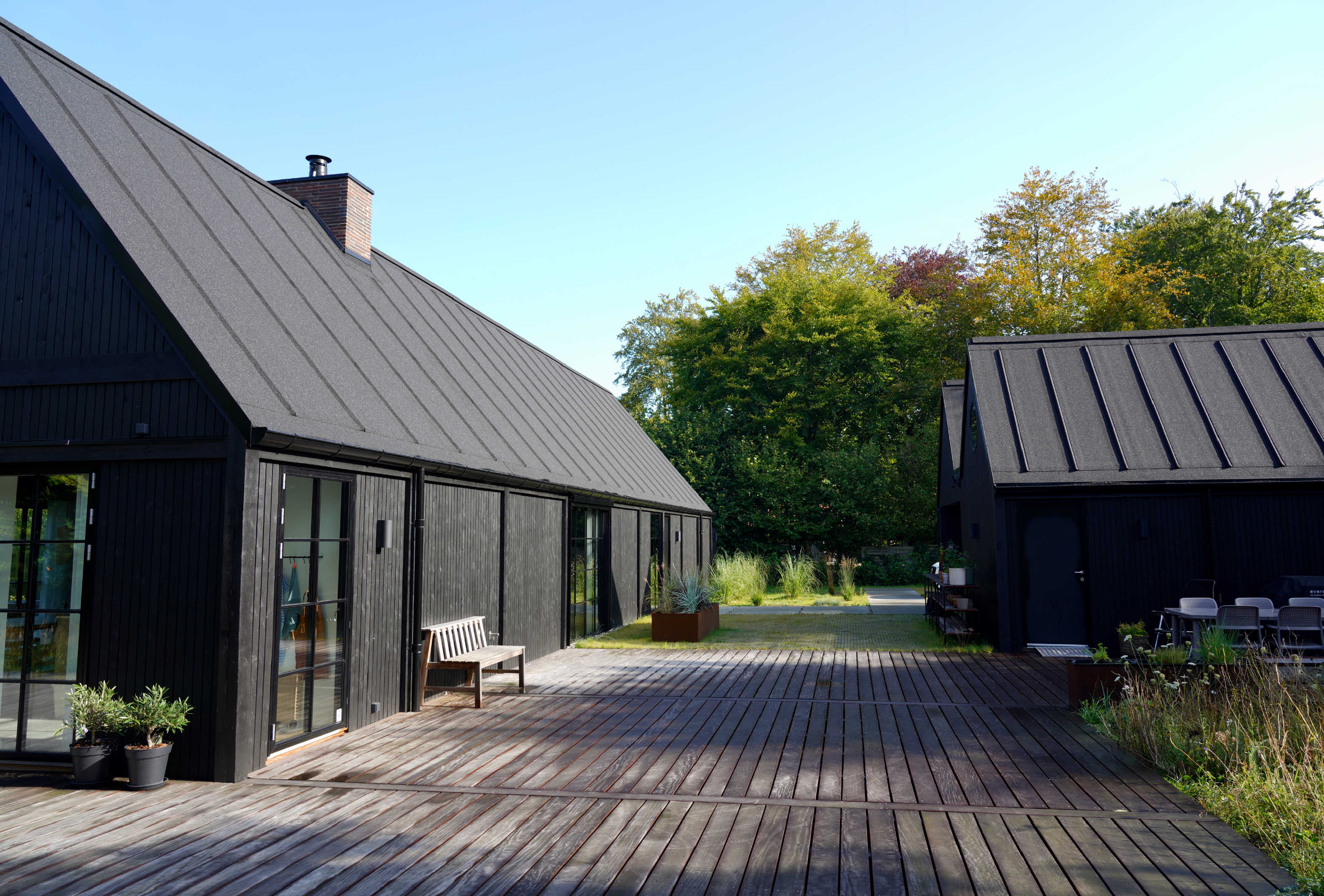 Når man ankommer til sommerhuset i Sænkningen giver længehuset og de to udhuse, med deres træbeklædte, sortmalede facader og tagpapbeklædte tage, i samspil med store indlevede træterrasser og felter med perforerede betonfliser med græs en behagelig følelse af ro og orden. Det er tydeligt, at her er et bygherrepar med styr på tingene.