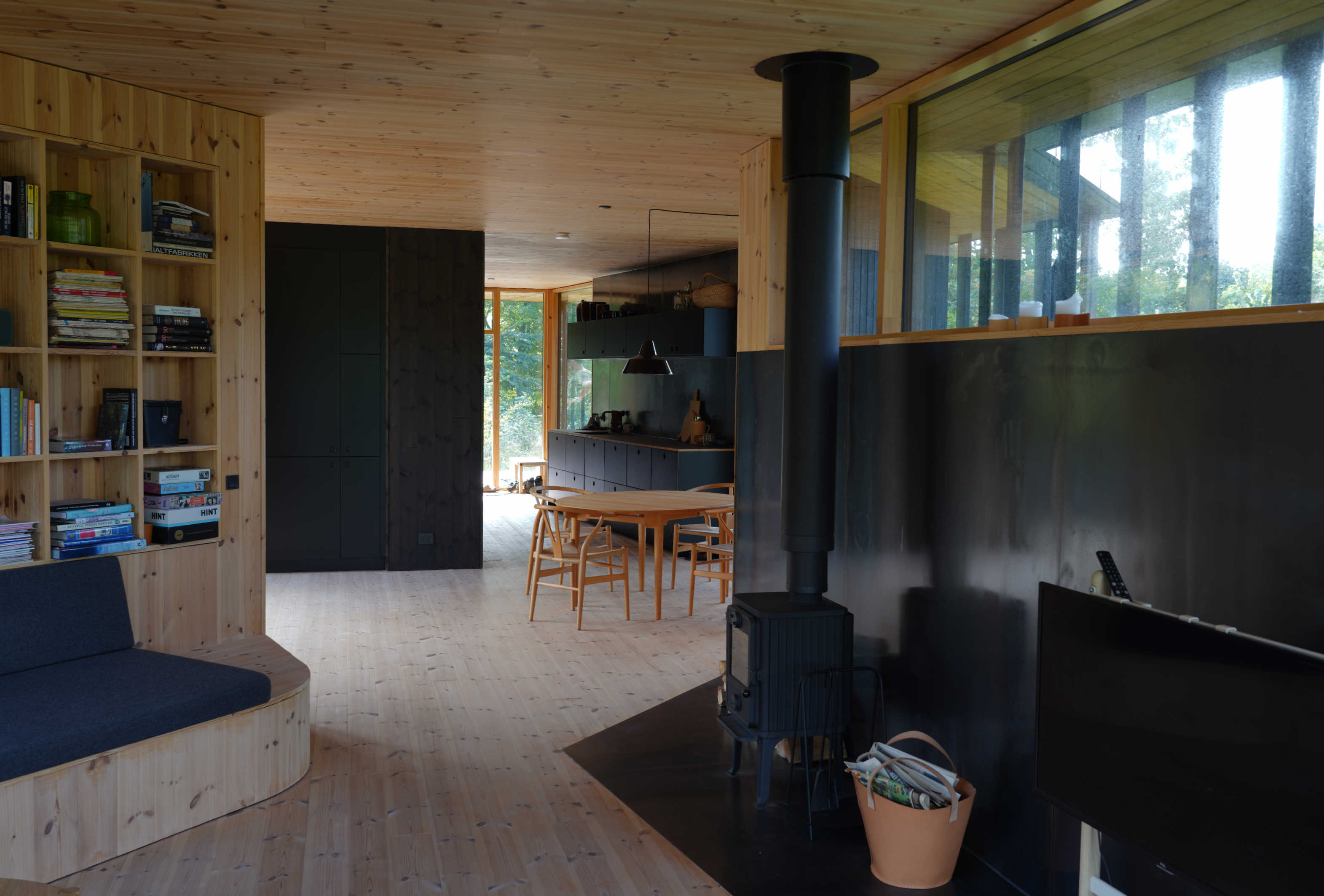 Den gode fornemmelse fortsætter inde i huset, hvor en karakterfuld fritstående skorsten med pejs danner rum og introducerer et storslået vue til et smukt køkken- og opholdsrum med højt til loftet. Mod nord er mindre rum med værelser, bad og toilet. Overbevisende arkitektoniske greb, som loftet der alle steder er åbent til kip og beklædt med en ubrudt mørk og støjdæmpende loftsbeklædning, det niveaufrie og gennemgående gulv med natursten fra Sicilien og langsidernes store, fint underopdelte, glaspartier tydeliggør på forbilledlig vis længehusets dna og forener på en overbevisende måde funktion og æstetik. Valget af gode, gedigne naturlige materialer er sympatisk og den håndværksmæssige bearbejdning af de delikate flader og detaljer er af høj kvalitet. Facadernes sortmalede partier af træ kan umiddelbart virke lidt kedelige, men den sikre opdeling af træbeklædningen og vinduespartiernes fine detaljer giver sammen med lysets reflekser og skyggespillet spændingsfyldte oplevelser.