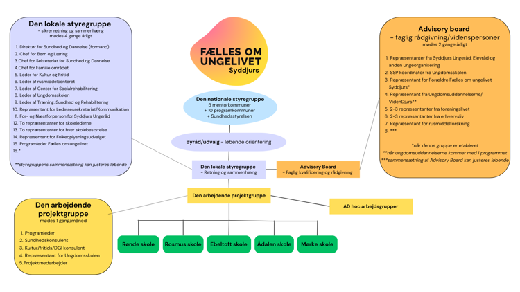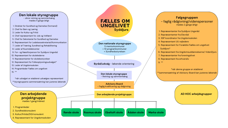 I Syddjurs kommune er programmet organiseret med en styregruppe, et advisory board og en arbejdende projektgruppe. Medlemmer tilføjes og udskiftes efter behov, som programmet udvikler sig.