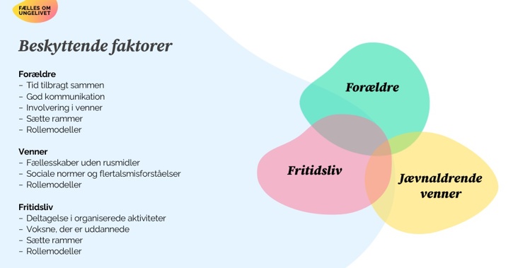 Inspireret af den islandske forebyggelsesmodel har Fælles om ungelivet fokus på beskyttende faktorer indenfor nogle af de helt centrale arenaer, hvori de unge befinder sig – nemlig familie, fritid, skole og vennegrupper. Ved at have fokus på beskyttende faktorer kan man ændre rammerne i miljøet omkring den unge, der har betydning for de unges brug af rusmidler.