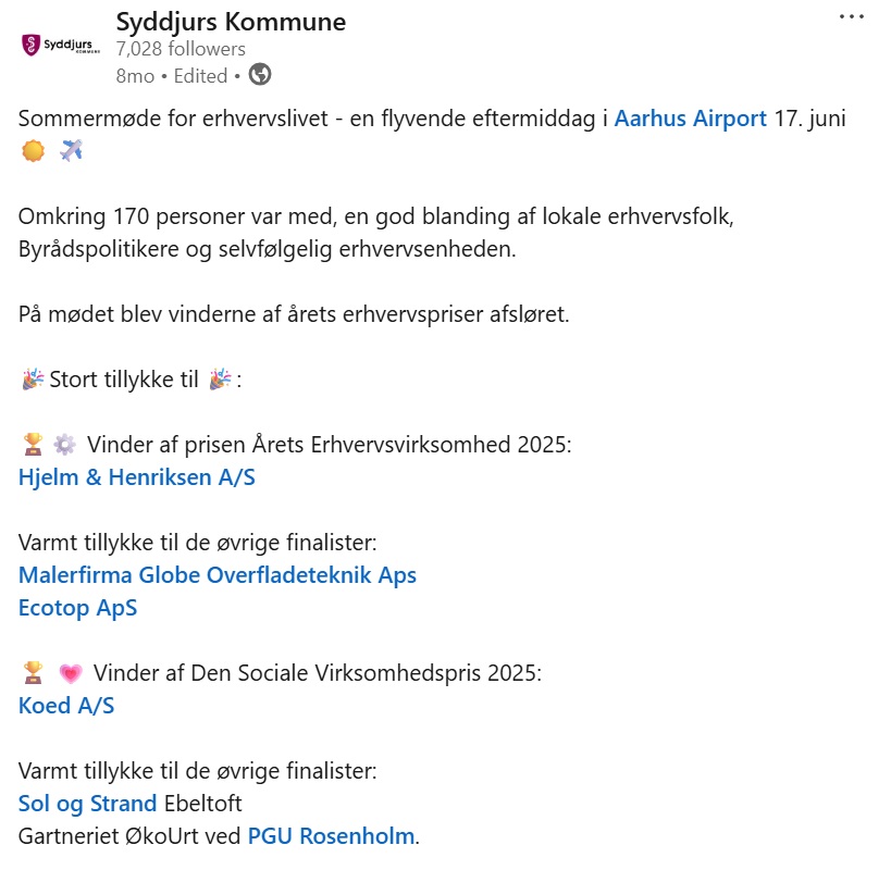 at virksomheden samarbejder med Syddjurs Kommune om at skabe virksomhedspraktikker samt at være med til at højne uddannelsesniveauet - eksempelvis ved at tilbyde elev- og lærlingepladser