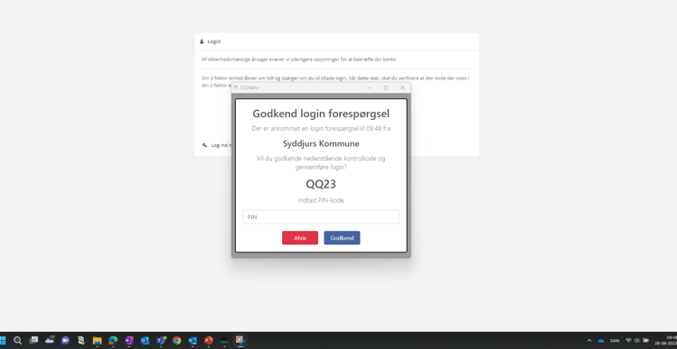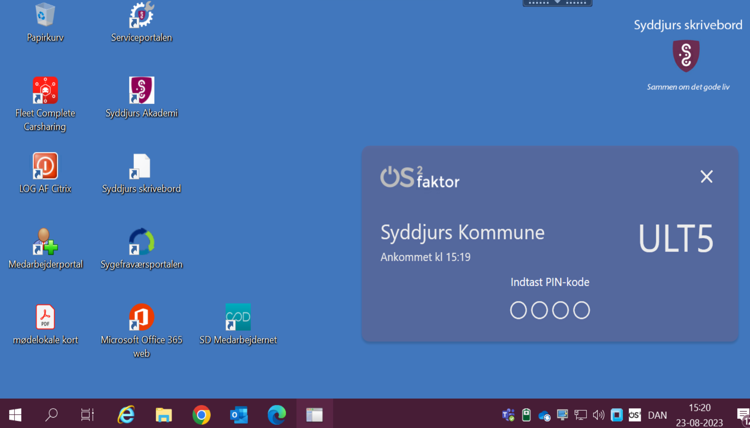 Når du bruger to-faktorgodkendelse på Syddjurs Skrivebord eller dit lokale skrivebord, vil der dukke en dialogboks på på din skærm. Her indtaster du din 4-cifrede kode