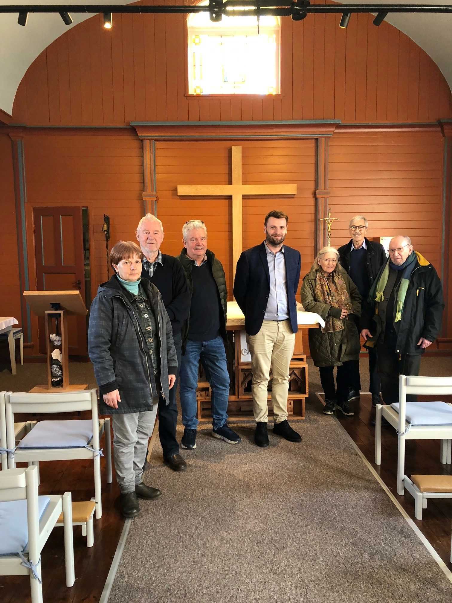 Efter en inspirerende drøftelse trillede det mobile borgmesterkontor videre. Selvom kalenderen viste, at vi er i den første forårsmåned, dryppede en kold regn over Thorsager Rundkirke ved ankomsten. Indenfor var der lunt, og her blev Borgmesteren modtaget af præst Anne Marie Poulsen Tolbod og medlemmer af menighedsrådene for Thorsager, Bregnet og Feldballe.
