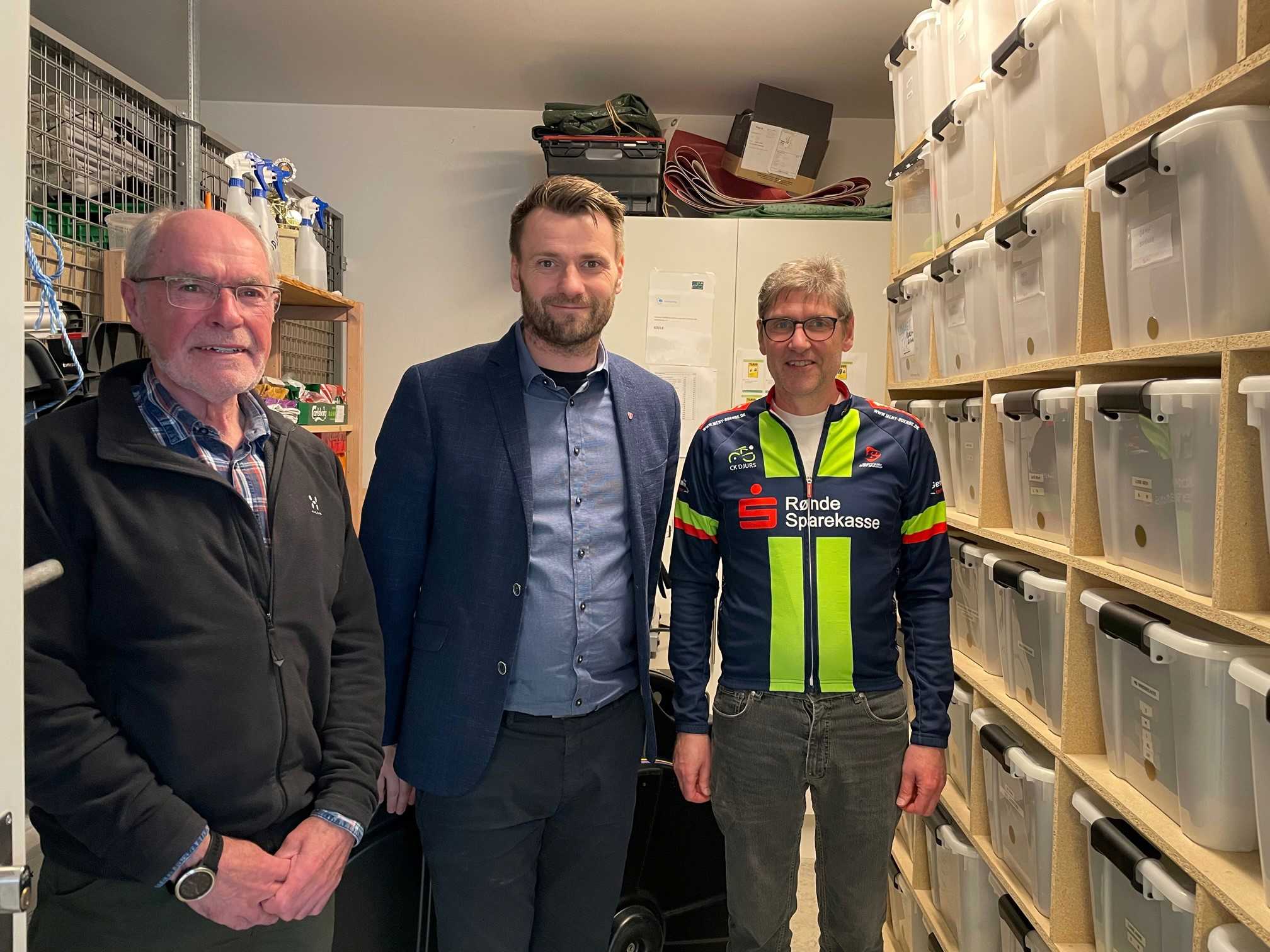 Herefter var det tid til noget af et sceneskift for det mobile borgmesterkontor: Næste punkt på programmet var besøg i CK Djurs - en lokal cykelklub en kort gåtur fra kirken i lokaler ved skolen. Her tog bestyrelsesmedlemmerne Jan Lau Nielsen og Hans Chr. Pedersen imod, den ene farverigt klædt i klubbens sponsortrøje.