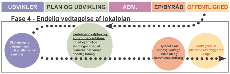 Fasen afsluttes med politisk vedtagelse af planforslagene i Byrådet samt en afgørelse om miljøvurdering. Derefter følger: