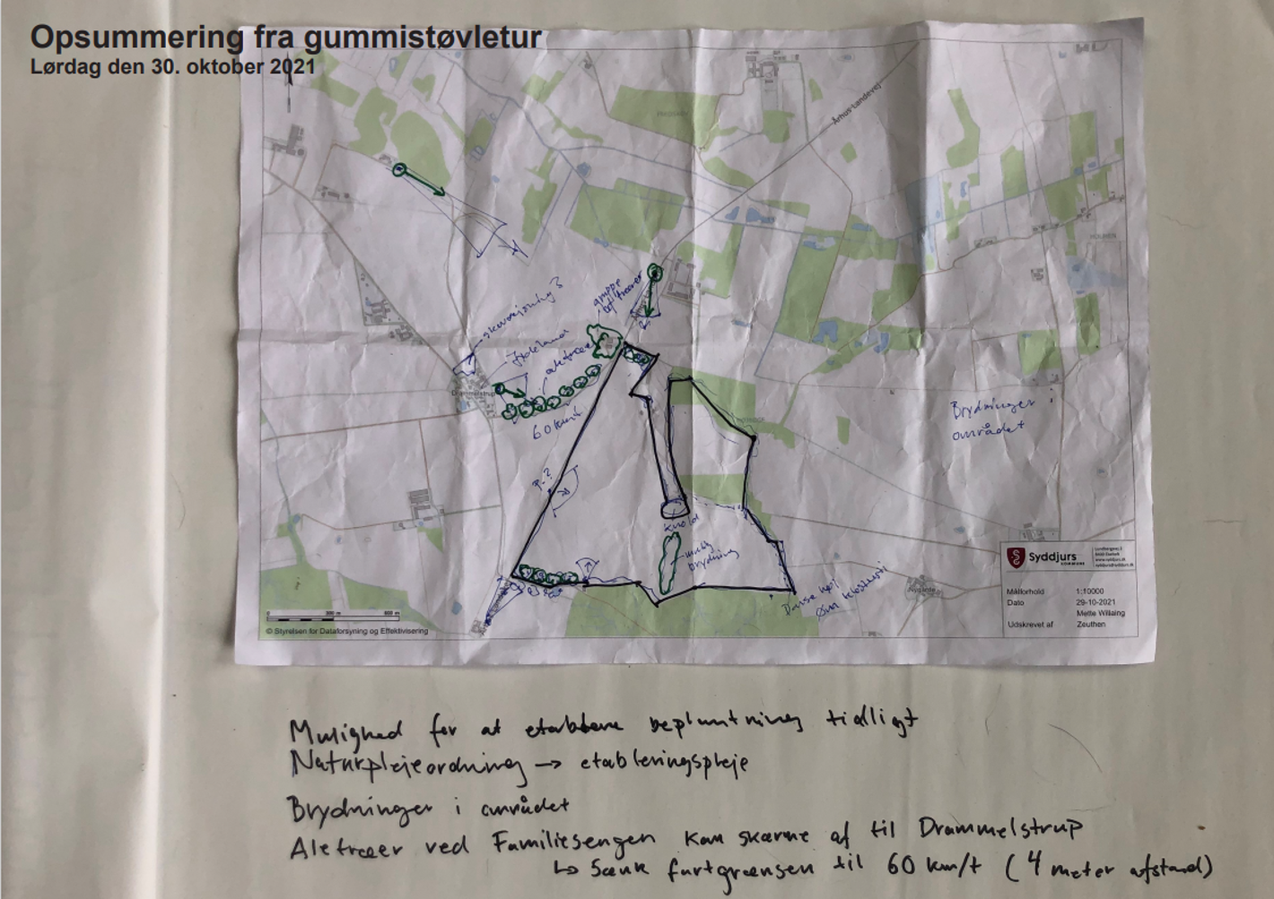 Efter cafémødet gik vi en tur i området. På gåturen så vi på de muligheder, der er for at arbejde med natur og indpasning i landskabet og deltagerne delte deres viden om området. De samtaler, som vi havde i marken, vil indgå i det videre arbejde.