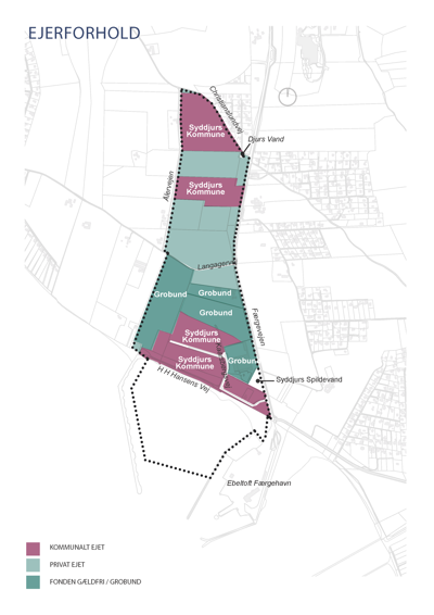 Grobund og Fonden Gældfri, der ejer ca. 18 hektar af helhedsplanens 65 hektar, skal udvikle egne arealer. Syddjurs Kommune forventes at udarbejde en lokalplan for området, for at det kan lade sig gøre.