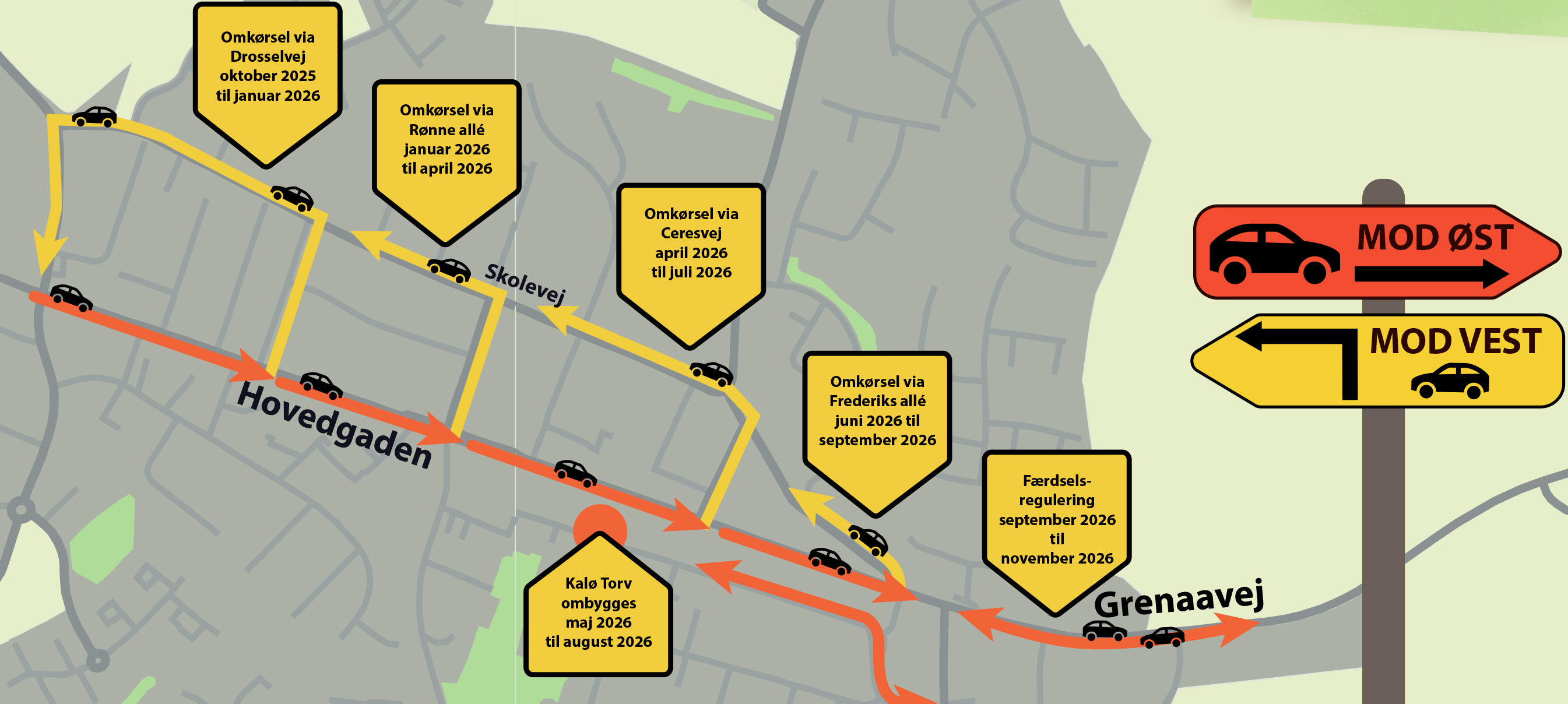 Hovedgaden vil være åben for kørsel op ad bakken mod øst under hele forløbet. Nedkørsel mod vest vil ske via omkørsler gennem sidegader og Skolevej. Der vil være skiltning og information for de mindre omkørsler.