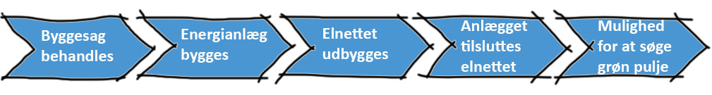 Når kommunen har givet tilladelse til, at der må bygges et anlæg til solenergi, begynder Energinet at planlægge udvidelsen af elnettet, så det kan aftage mere strøm. Der føres altså ikke nye ledninger og bygges transformerstationer, før man er sikker på, at anlægget bliver til noget.