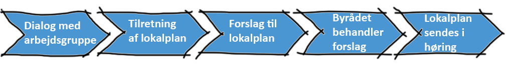 Administrationen udarbejder et forslag til lokalplan og tillæg til kommuneplan. Alle relevante afdelinger i kommunen vurderer planerne i en intern høring. Der laves også en miljøvurdering af planerne. Det endelige forslag til planerne sendes i de politiske udvalg.