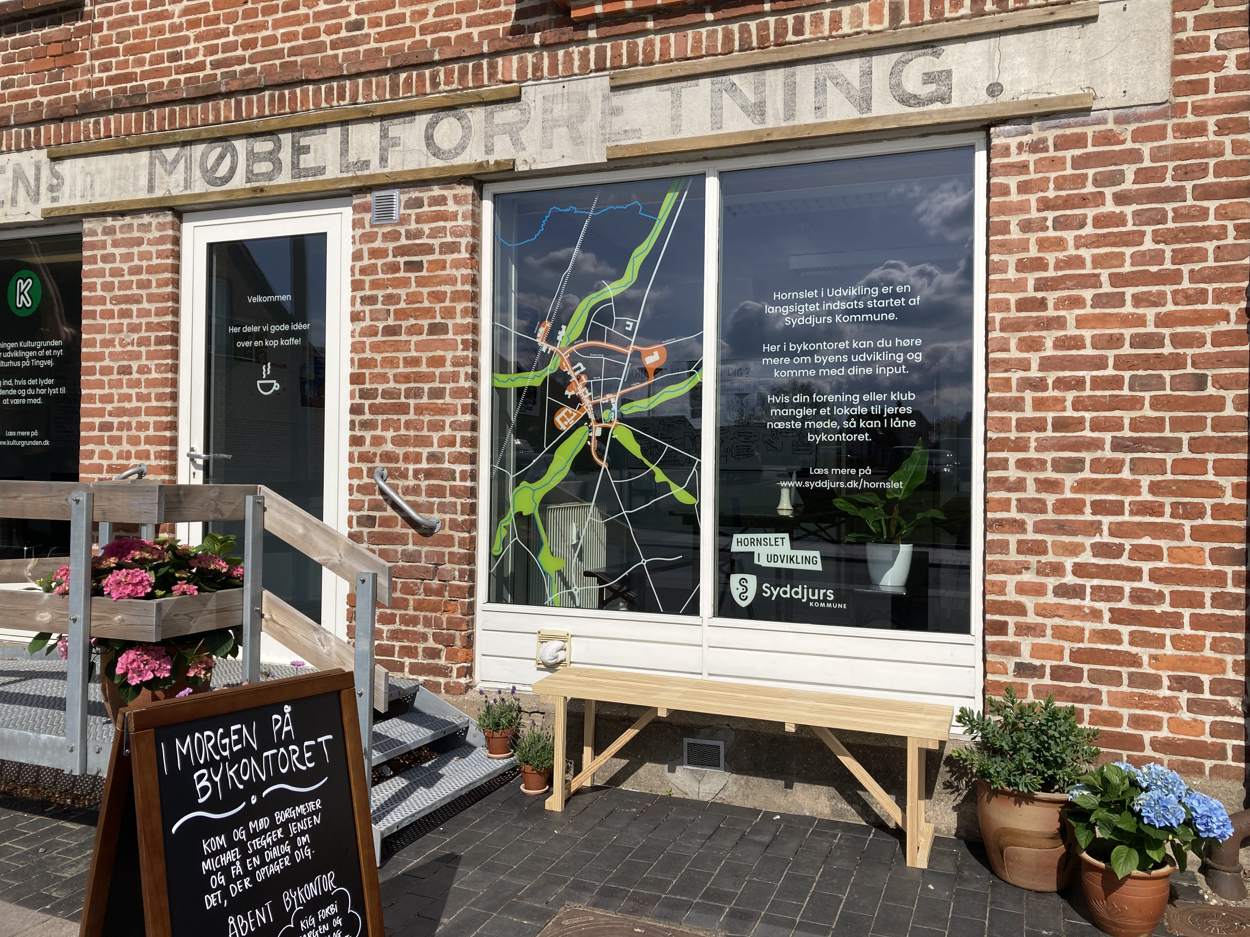 I samarbejde med Foreningen Kulturgrunden har Hornslet i Udvikling i foråret 2022 åbnet et fysisk bykontor på Tingvej 18 i Hornslet bymidte.